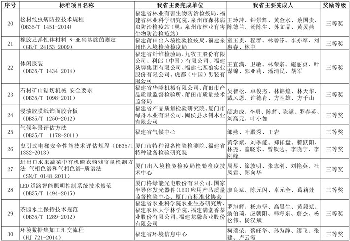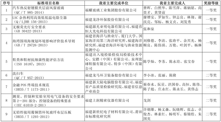 根据福建省标准贡献奖评审程序,经省标准贡献奖励委员会评审,省政府同意授予《汽车热反射镀膜夹层前风窗玻璃》(QC/T 985-2014)等30项标准“2016年福建省标准贡献奖”称号,其中一等奖5项、二等奖9项、三等奖16项(具体名单见附件)。