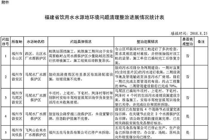 现将《福建省饮用水水源地环境问题清理整治进展情况统计表》函报生态环境部、水利部。
