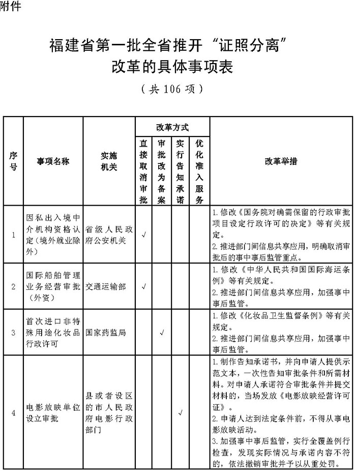 附件:福建省第一批全省推开“证照分离”改革的具体事项表