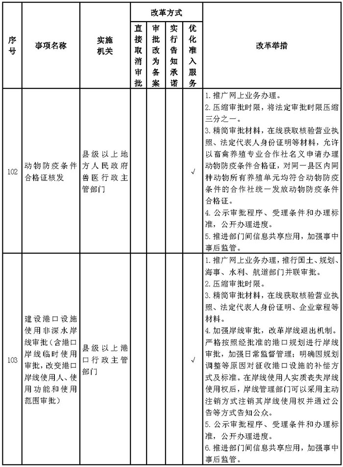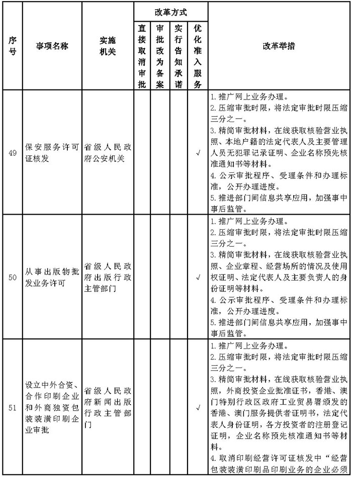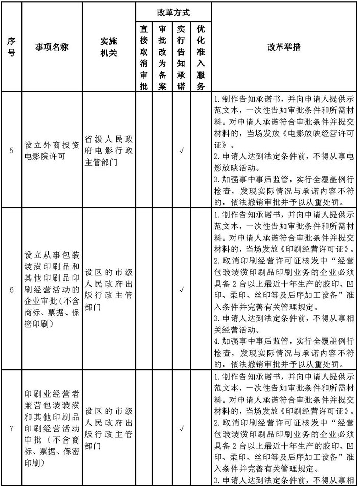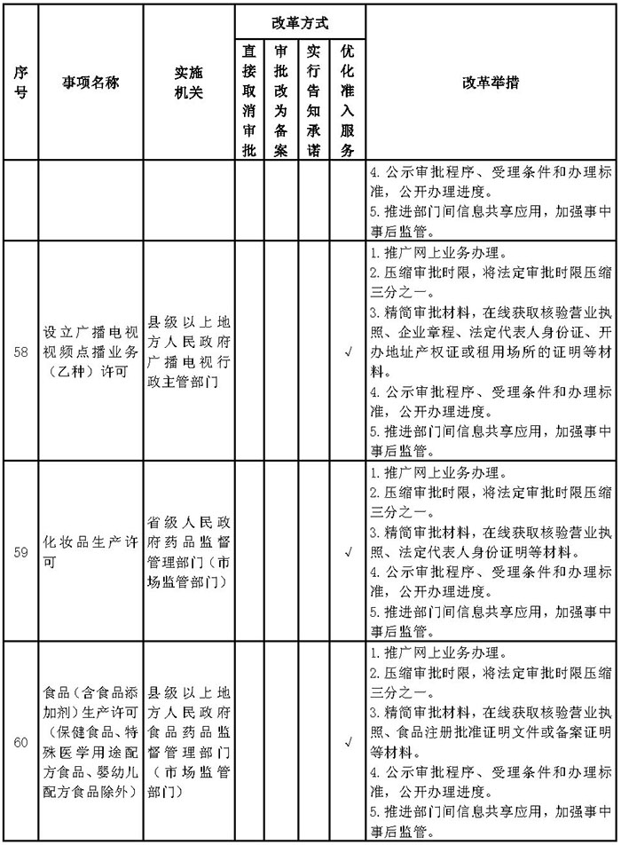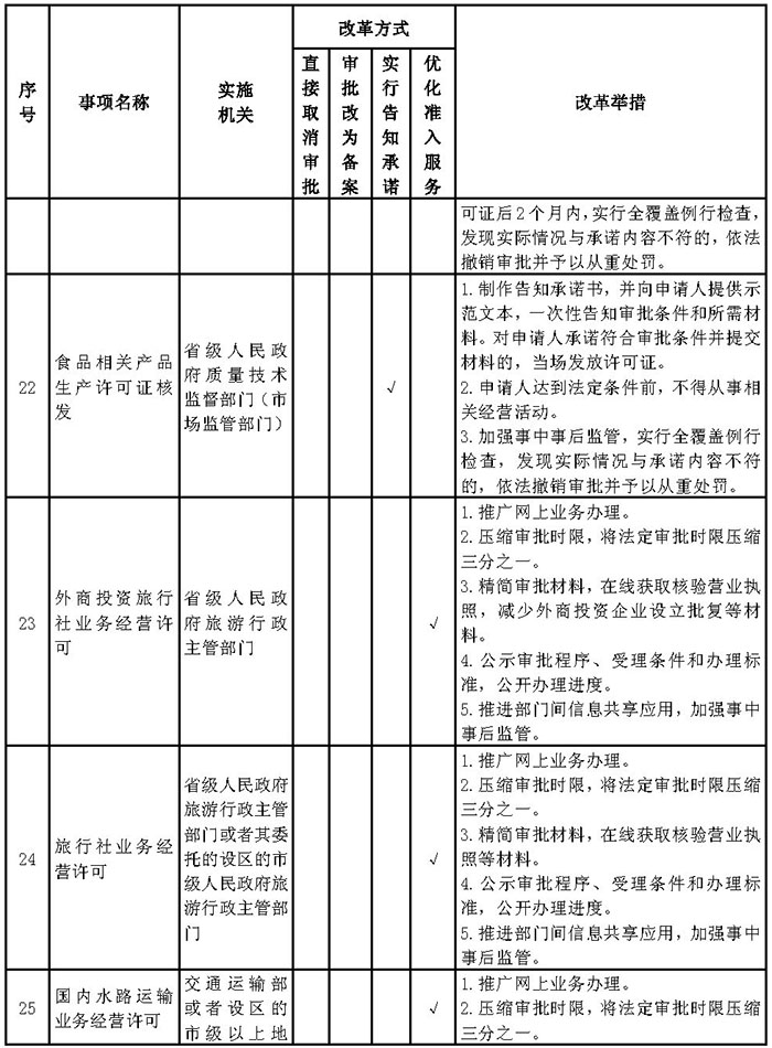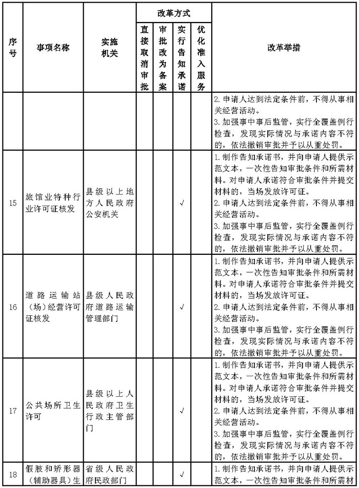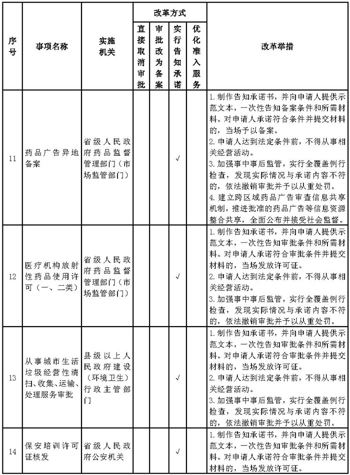 2018年11月10日起,根据国务院公布的《第一批全国推开“证照分离”改革的具体事项表》,在全省范围内对106项涉企行政审批事项(见附件)分别按照直接取消审批、审批改为备案、实行告知承诺、优化准入服务等四种方式实施“证照分离”改革。加强事中事后监管,建立部门间信息共享、协同监管和联合奖惩机制,形成全过程监管体系。按照国务院统一部署,建立长效机制,做到成熟一批复制推广一批,逐步减少涉企行政审批事项,在全省有序推开“证照分离”改革,对涉及市场准入的行政审批事项按照“证照分离”改革模式进行分类管理,为企业进入市场提供最大便利。