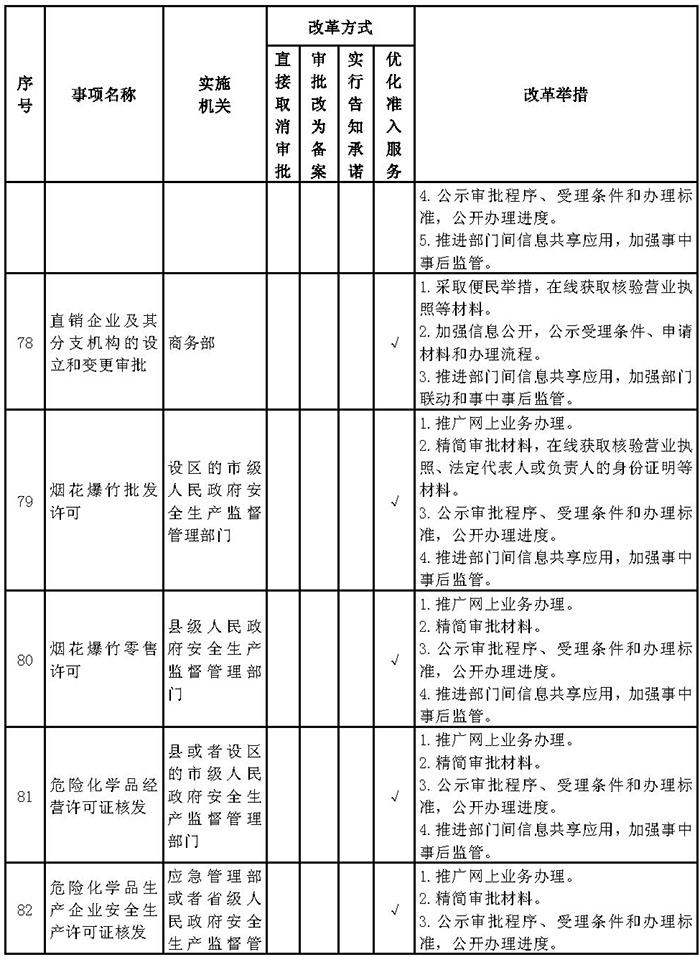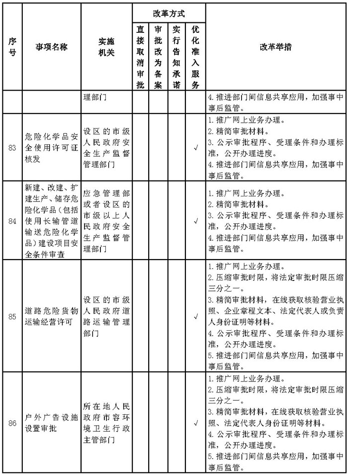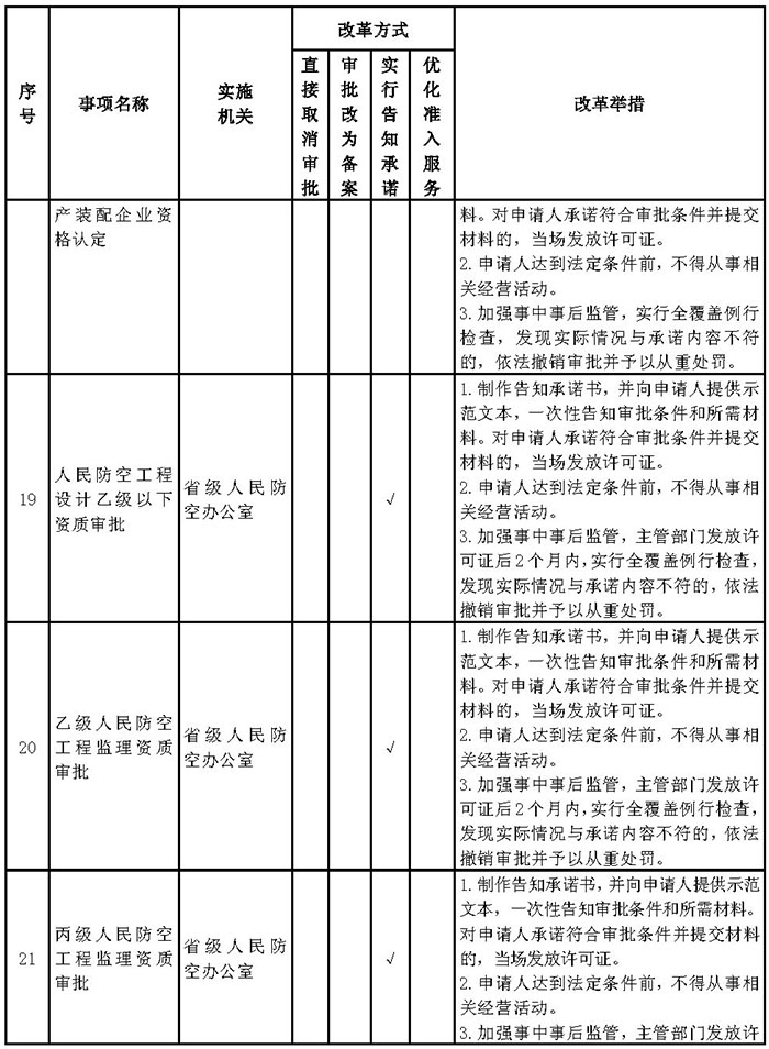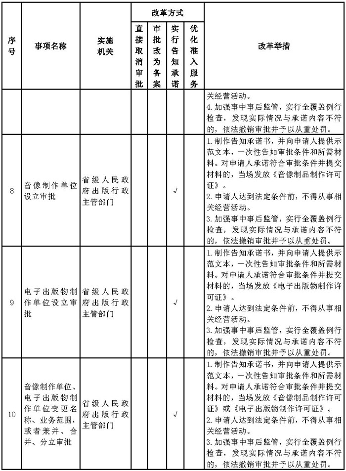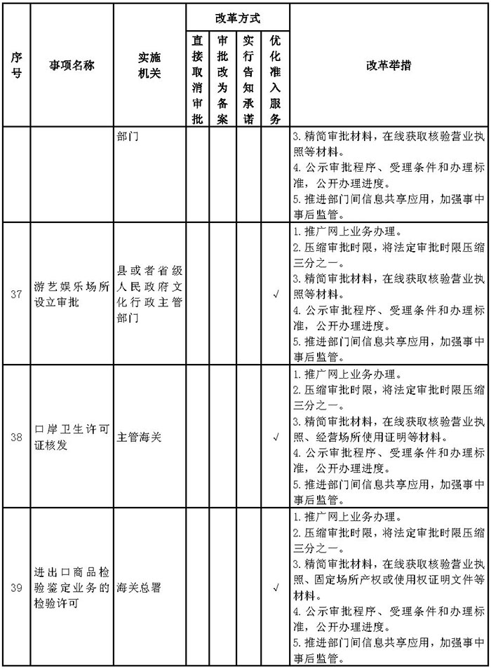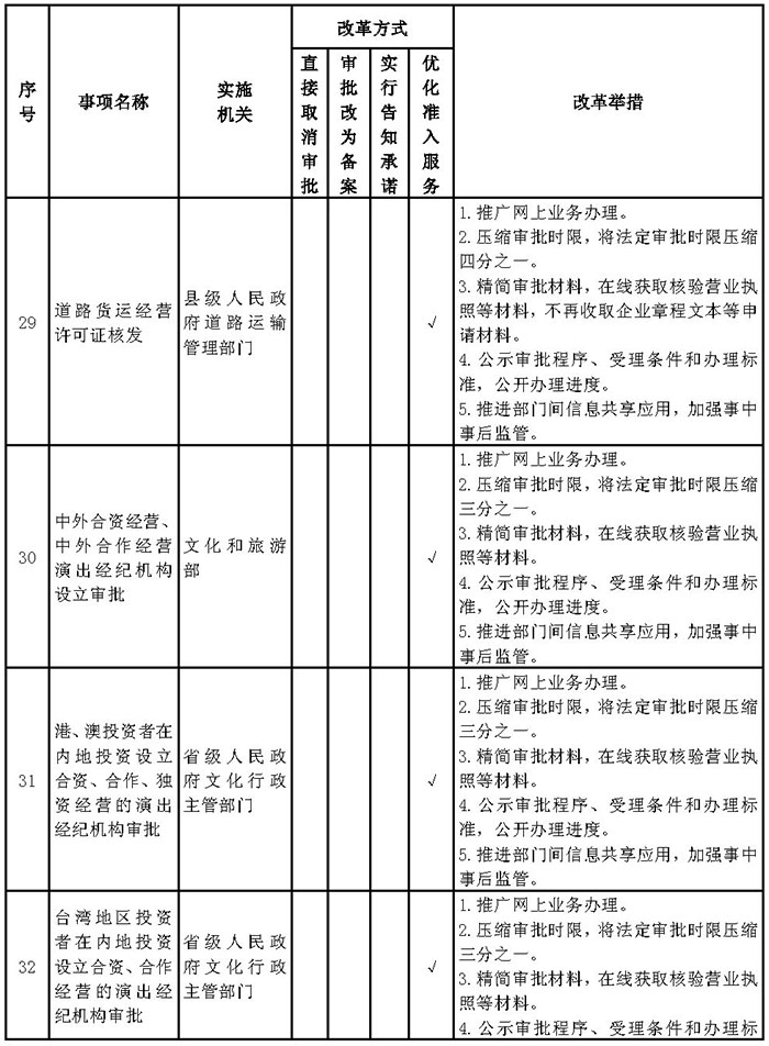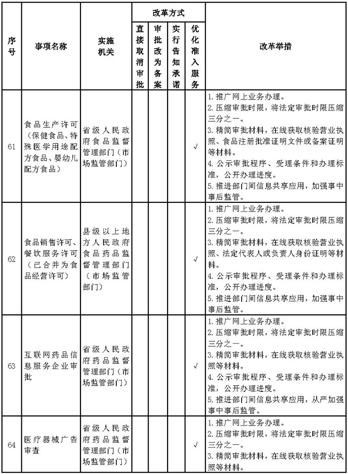 2018年11月10日起,根据国务院公布的《第一批全国推开“证照分离”改革的具体事项表》,在全省范围内对106项涉企行政审批事项(见附件)分别按照直接取消审批、审批改为备案、实行告知承诺、优化准入服务等四种方式实施“证照分离”改革。加强事中事后监管,建立部门间信息共享、协同监管和联合奖惩机制,形成全过程监管体系。按照国务院统一部署,建立长效机制,做到成熟一批复制推广一批,逐步减少涉企行政审批事项,在全省有序推开“证照分离”改革,对涉及市场准入的行政审批事项按照“证照分离”改革模式进行分类管理,为企业进入市场提供最大便利。