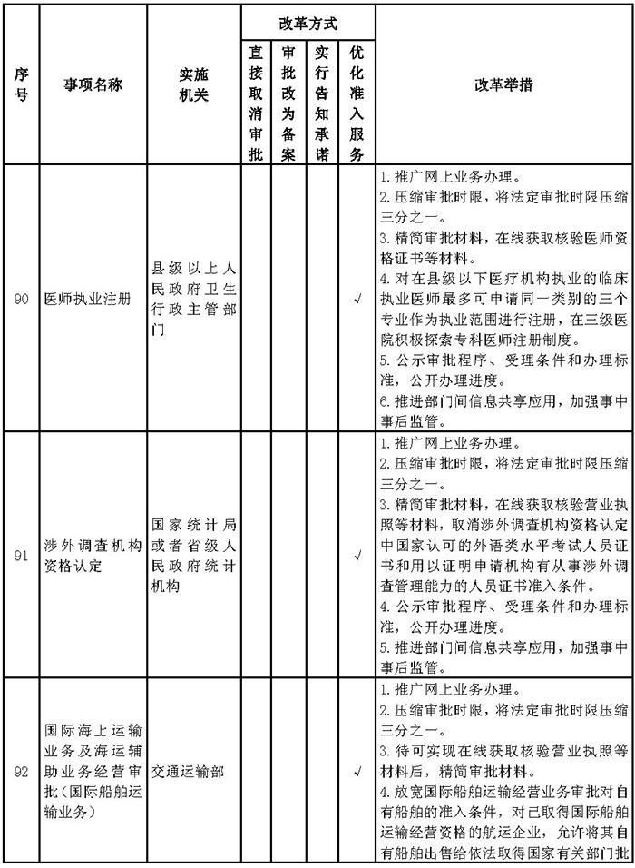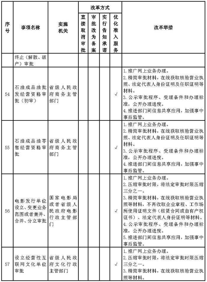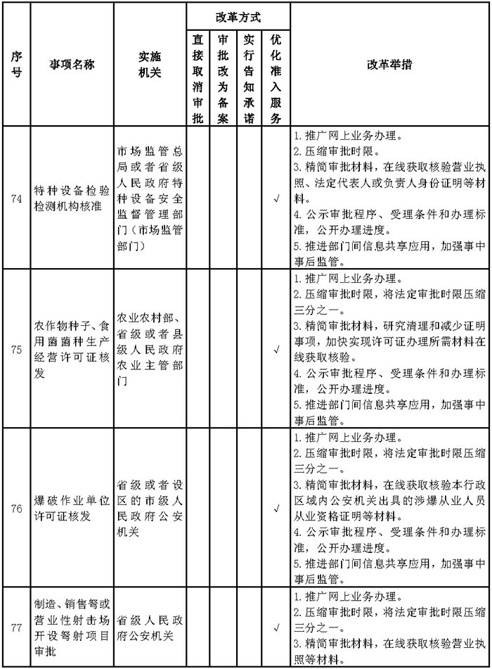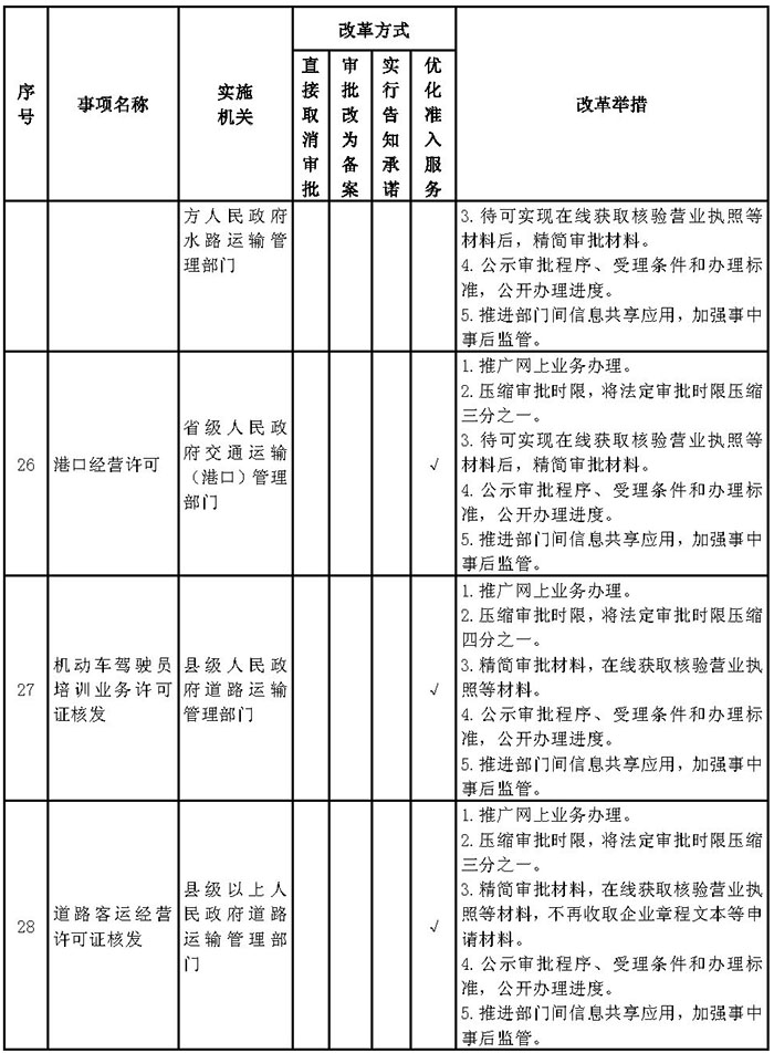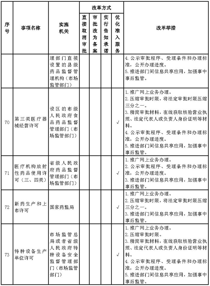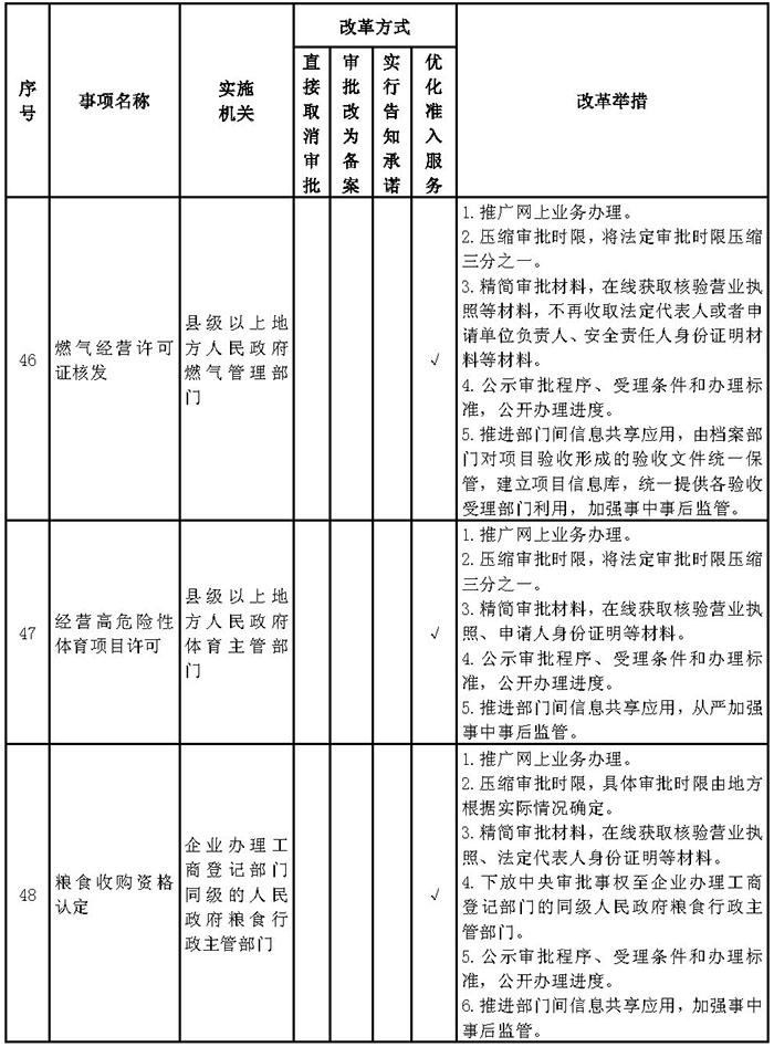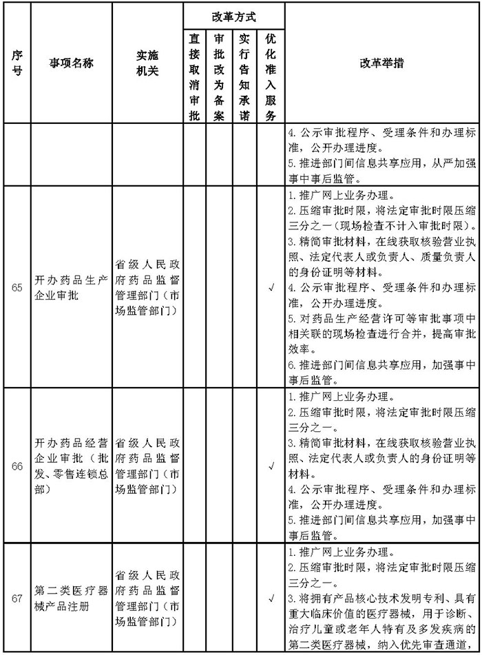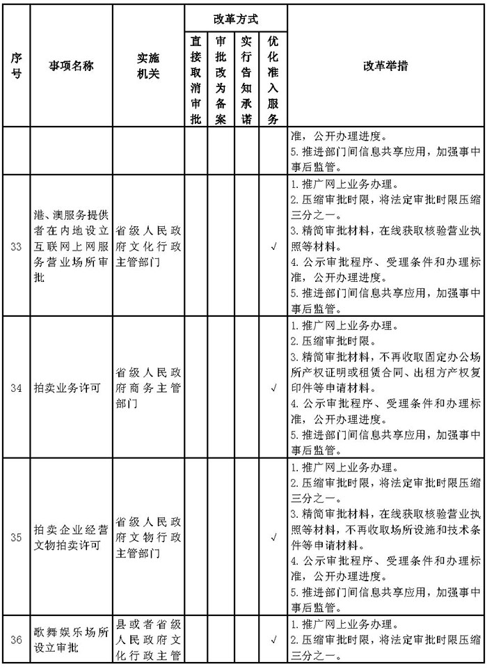 2018年11月10日起,根据国务院公布的《第一批全国推开“证照分离”改革的具体事项表》,在全省范围内对106项涉企行政审批事项(见附件)分别按照直接取消审批、审批改为备案、实行告知承诺、优化准入服务等四种方式实施“证照分离”改革。加强事中事后监管,建立部门间信息共享、协同监管和联合奖惩机制,形成全过程监管体系。按照国务院统一部署,建立长效机制,做到成熟一批复制推广一批,逐步减少涉企行政审批事项,在全省有序推开“证照分离”改革,对涉及市场准入的行政审批事项按照“证照分离”改革模式进行分类管理,为企业进入市场提供最大便利。