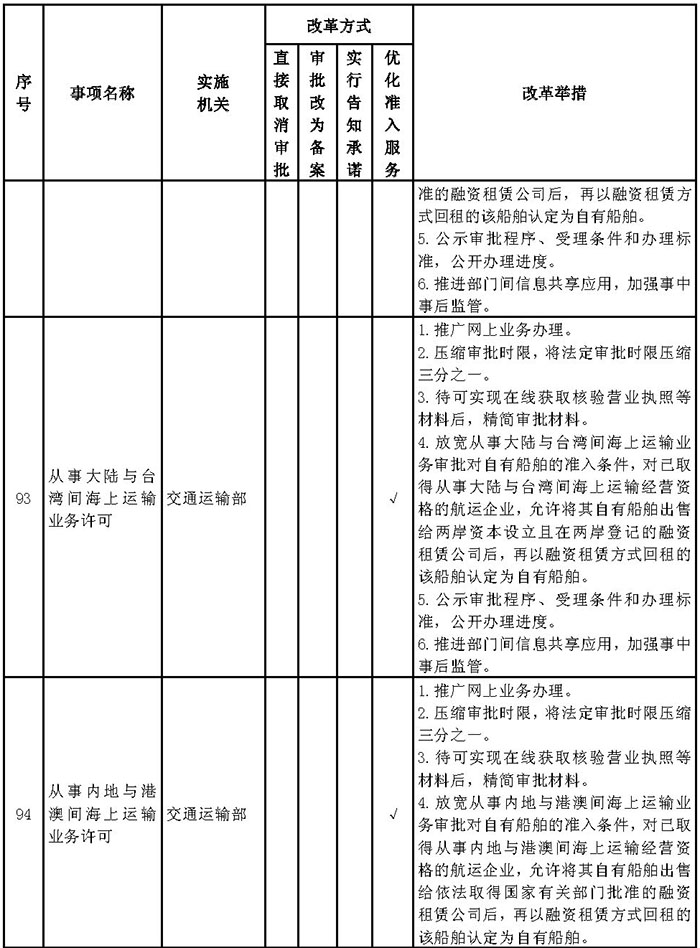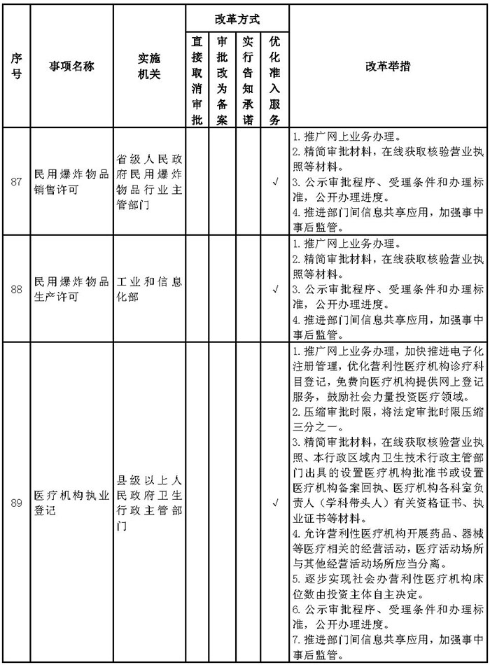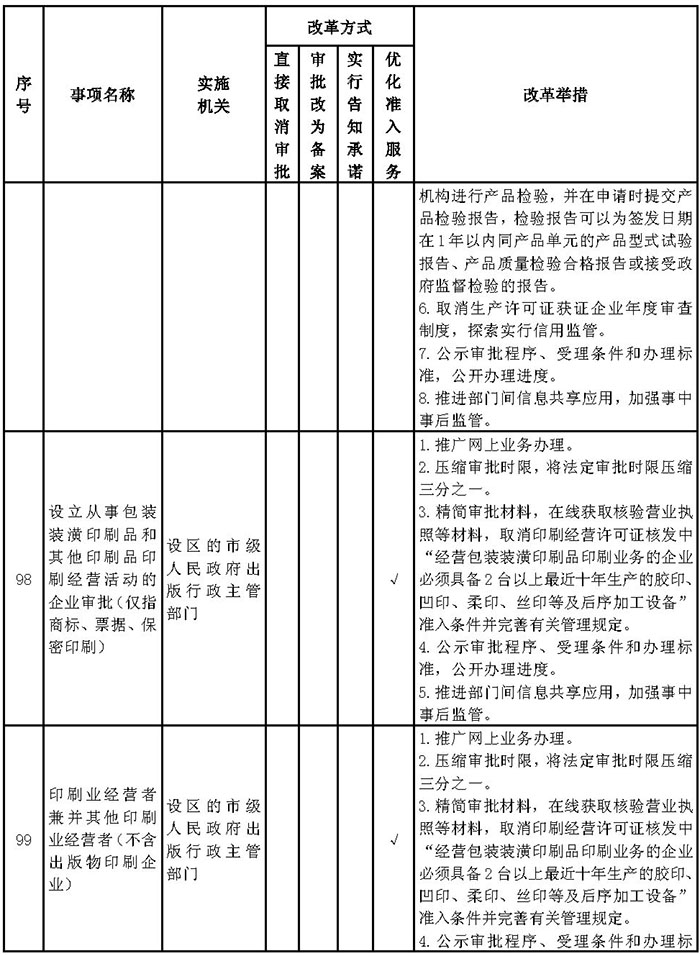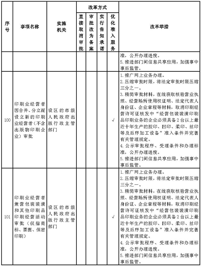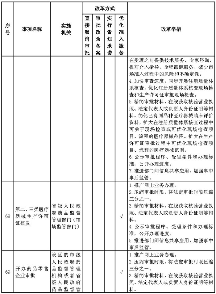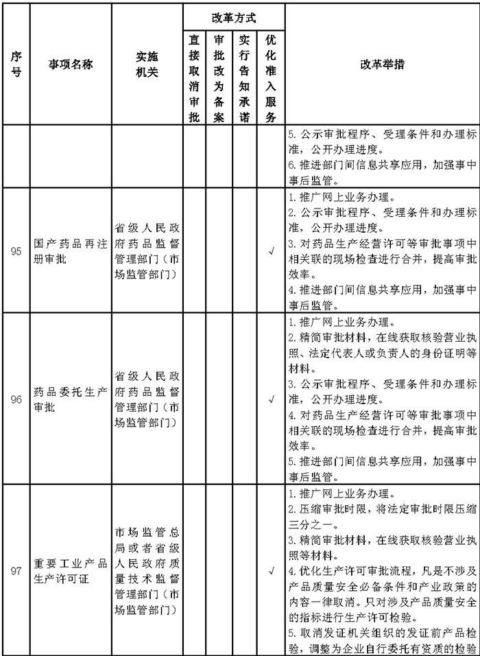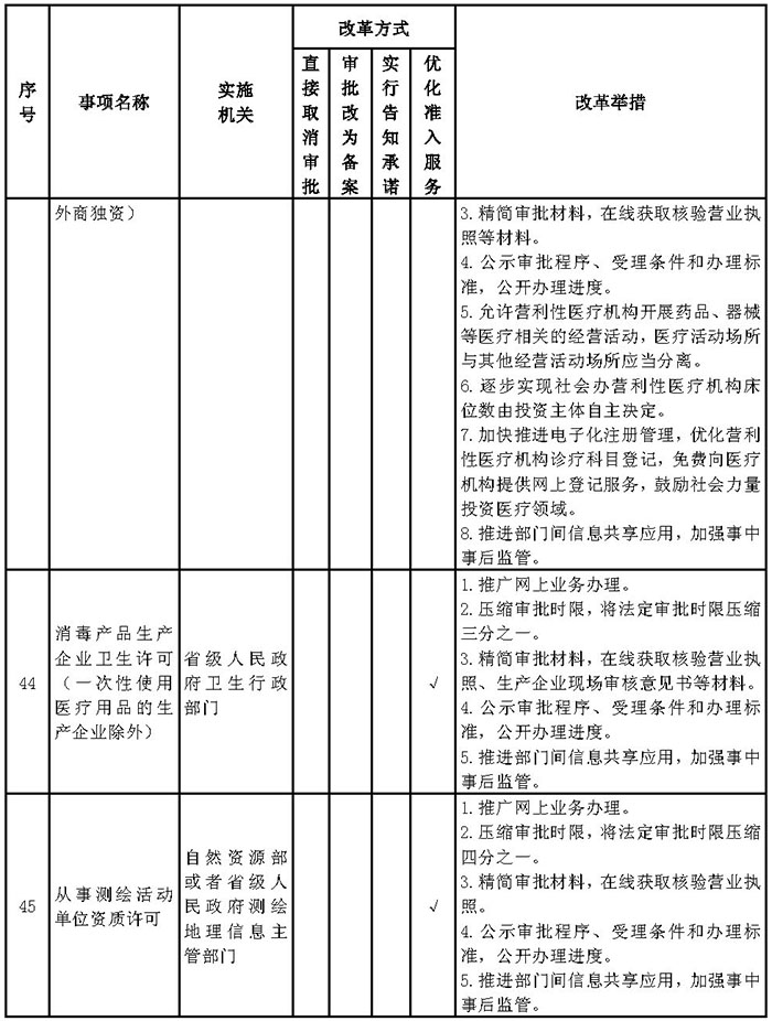 2018年11月10日起,根据国务院公布的《第一批全国推开“证照分离”改革的具体事项表》,在全省范围内对106项涉企行政审批事项(见附件)分别按照直接取消审批、审批改为备案、实行告知承诺、优化准入服务等四种方式实施“证照分离”改革。加强事中事后监管,建立部门间信息共享、协同监管和联合奖惩机制,形成全过程监管体系。按照国务院统一部署,建立长效机制,做到成熟一批复制推广一批,逐步减少涉企行政审批事项,在全省有序推开“证照分离”改革,对涉及市场准入的行政审批事项按照“证照分离”改革模式进行分类管理,为企业进入市场提供最大便利。