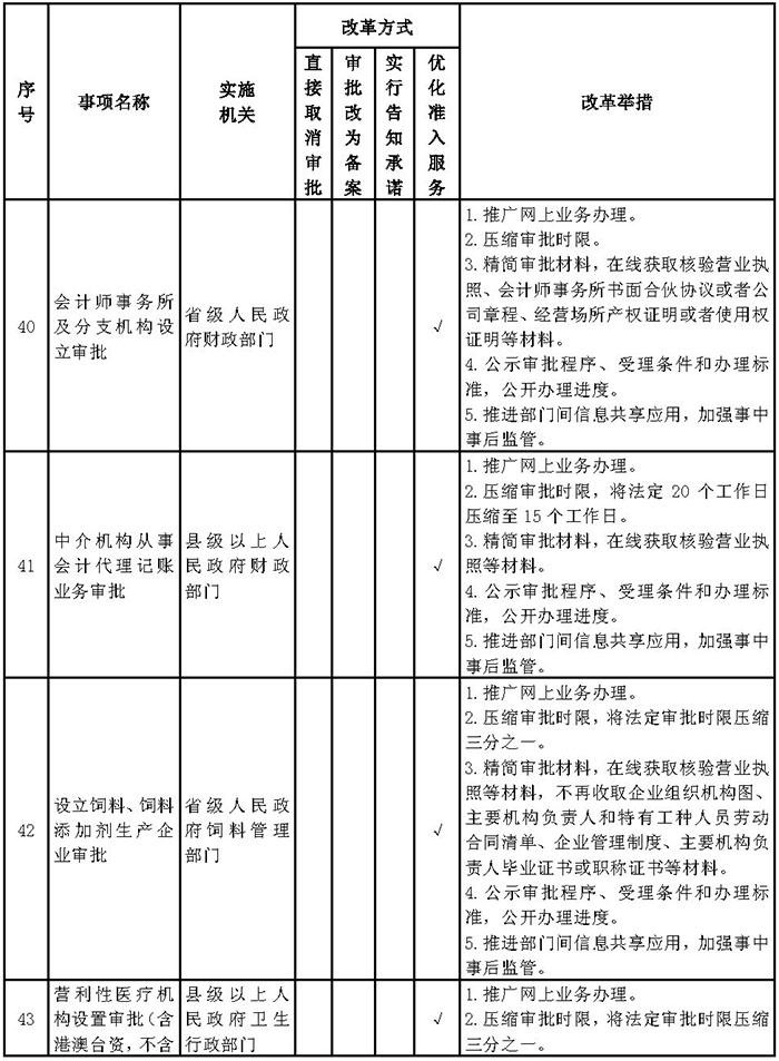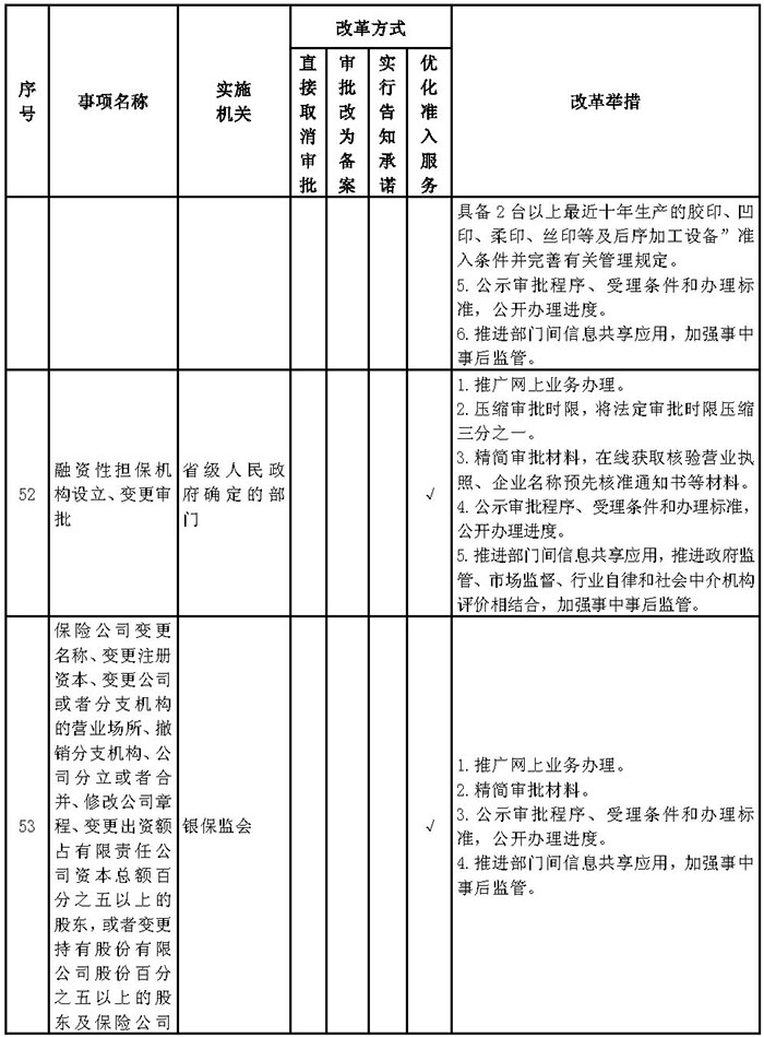 对直接取消审批、审批改为备案的行政审批事项,要有针对性地制定后续监管措施,其中对审批改为备案的,要明确备案所需报送材料;对实行告知承诺的行政审批事项,要制作告知承诺书、并向申请人提供示范文本,一次性告知申请人审批条件和所需材料,对申请人承诺符合审批条件并提交有关材料的,当场办理审批;对优化准入服务的行政审批事项,要针对市场主体关心的难点痛点问题,精简审批材料,公示审批事项和程序,要压缩审批时限、明确受理条件和办理标准,要减少审批环节、科学设计流程,要下放审批权限、增强审批透明度和可预期性,提高登记审批效率。