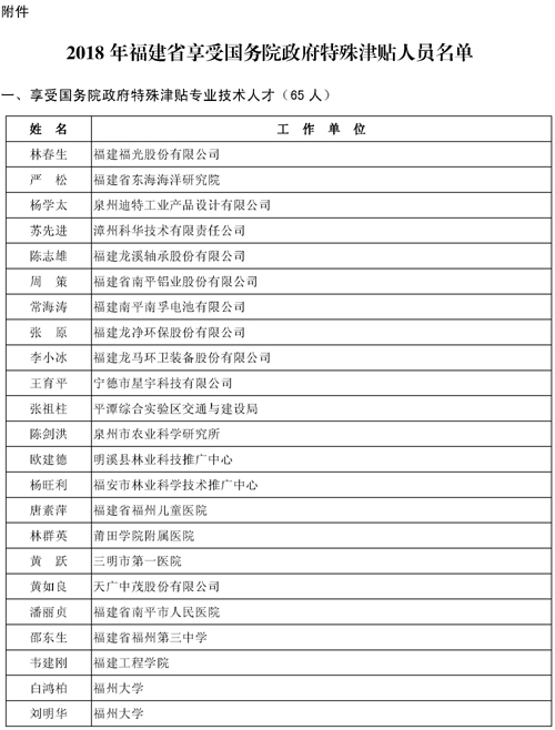 附件:2018年福建省享受国务院政府特殊津贴人员名单